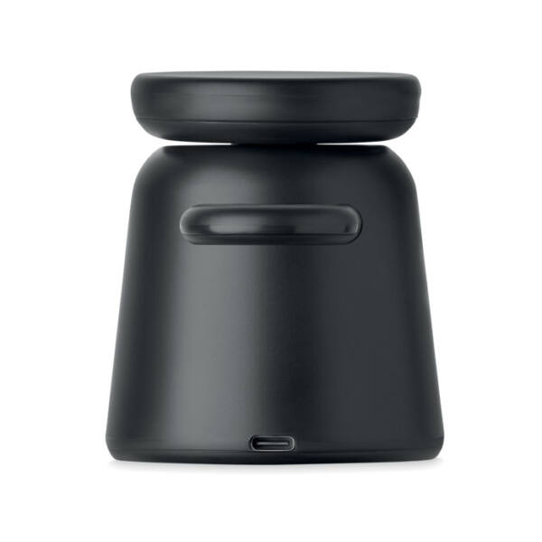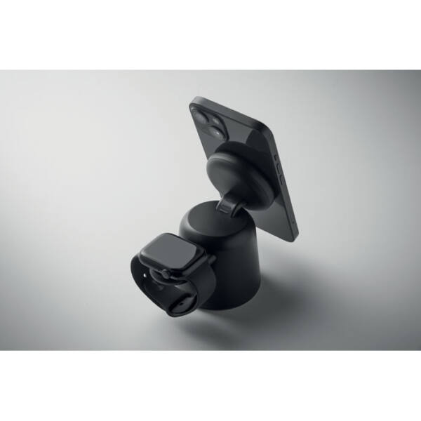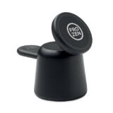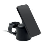Esta base de carga 3 en 1 está elaborada en ABS. Incluye un cargador inalámbrico magnético de 15 W para teléfono y TWS con función de soporte para teléfono y cargador para smartwatch (solo iOS). Su función magnética es compatible con iPhone® 12 y posteriores.