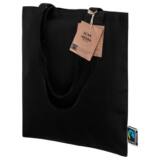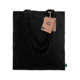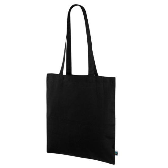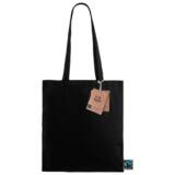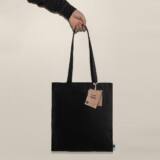 Esta bolsa esta fabricada en algodón Fairtrade de 180gr/m2 de color negro que le da un toque elegante. Su amplitud es suficiente para llevar lo que necesites en el día a día. Tiene unas asas de 35cm para su manejo cómodo y versátil. Resiste hasta 10 kg de carga.