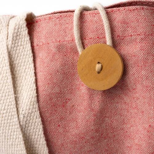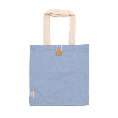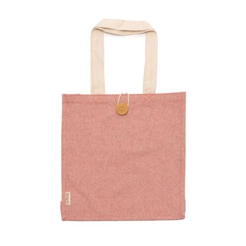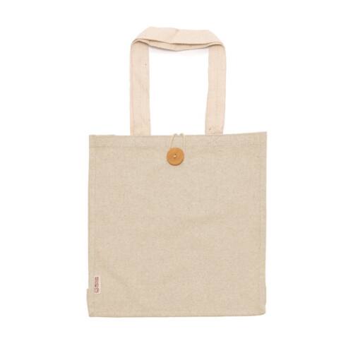Bolsa de algodón reciclado de 300 g/m², con asas largas reforzadas de 35 cm. Esta bolsa es una opción práctica, sostenible y versátil para el transporte de tus objetos personales. Tiene un práctico cierre por botón y un pequeño bolsillo interior. Tiene una gamma de cuatro colores.