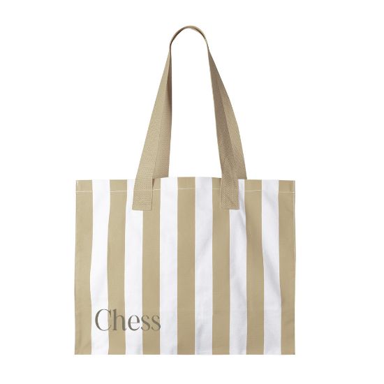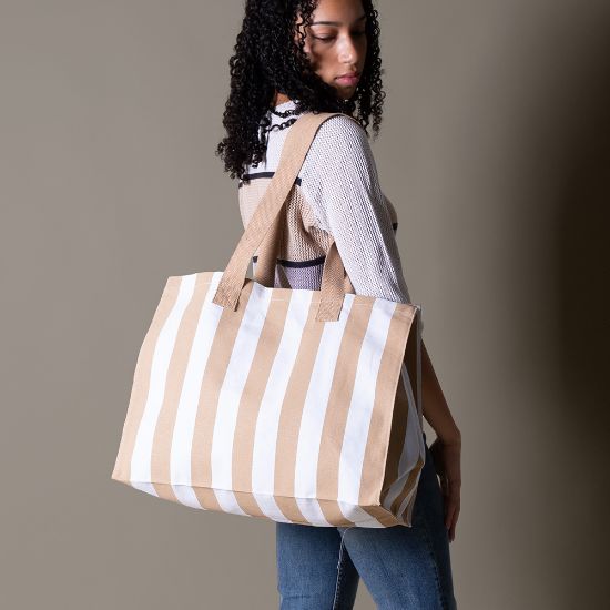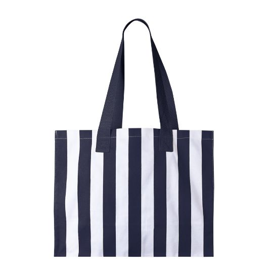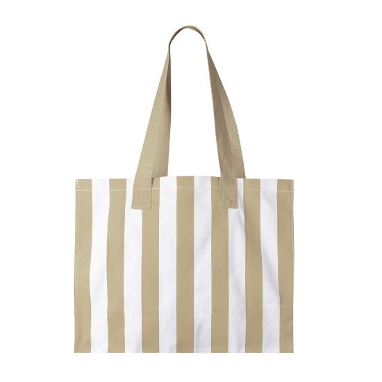 Esta bolsa es de algodón reciclado GRS de 310 g/m². Se presenta en color blanco de base con rayas a color a elegir entre tres opciones. Es perfecta para llevar lo necesario en un día de playa. Tiene unas asas de 35 cm también en el color de las rayas. Es una opción amplia, práctica y sostenible.