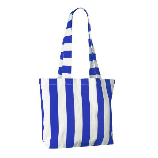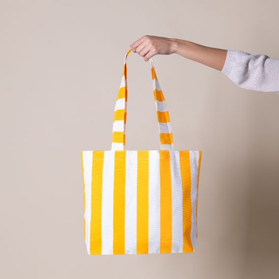 Esta bolsa es de algodón reciclado GRS de 220 g/m². Se presenta en color blanco de base con rayas a color a elegir entre tres opciones. Es perfecta para llevar lo necesario en un día de playa. Tiene unas asas de 35 cm también a rayas blancas y de color. Es una opción divertida, práctica y sostenible.