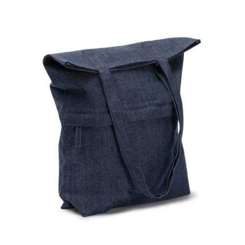 Bolsa de tejido vaquero de 280 g/m² multifuncional, con bolsillo frontal para el almacenaje y transporte de pequeños objetos con cierre de cremallera en el mismo color de la bolsa. Tiene un gran compartimento principal con fondo amplio para poder transportar todo aquello que necesites y cómoda de llevar gracias a sus asas largas. Cuenta con dos asas extensibles de 35 cm de longitud.