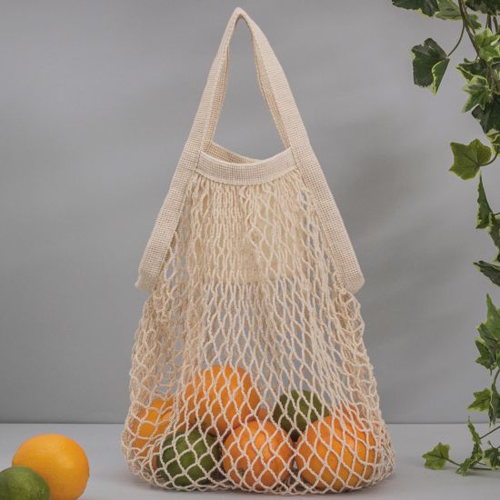 Esta bolsa esta fabricada en red de algodón con asas de 25cm y es ideal para frutería. Es la bolsa adecuada para el transporte de pequeñas cantidades de verdura o fruta sin que se forme condensación que estropee el producto. Incluye un práctico bolsillo interior para guardar la compra más pequeña. Es una opción ecológica que evita el uso de plásticos. Se presenta en color natural. Su resistencia es de hasta 4kg de peso.