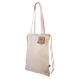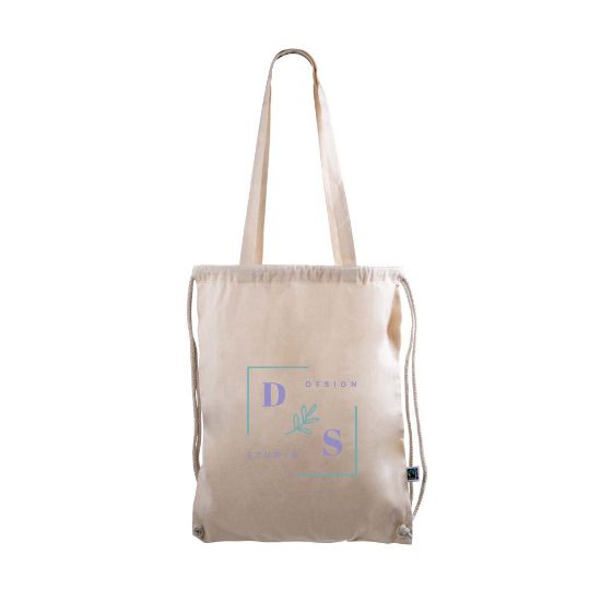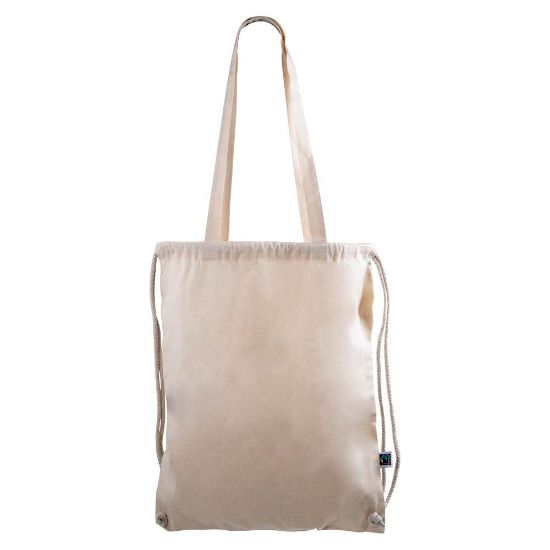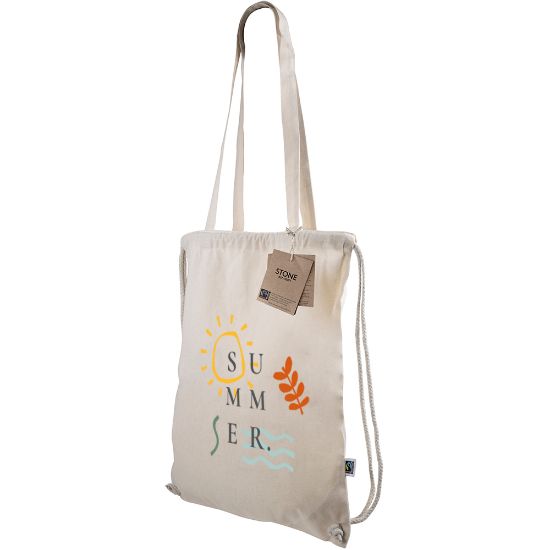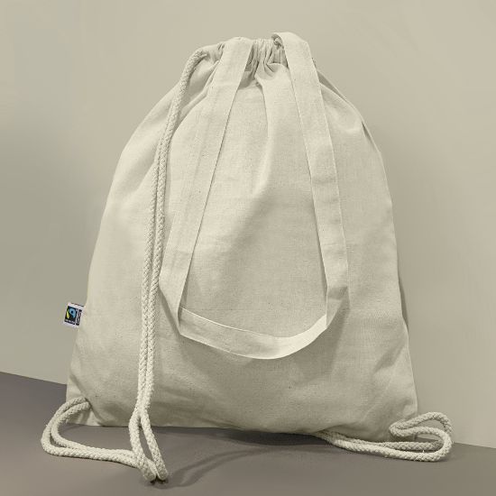 Esta mochila 2 en 1 con cordones y asas, fabricada en algodón Fairtrade, es de 140gr/m2. Es perfecta para transportar tus objetos con la mayor adaptabilidad y versatilidad posible. Tiene unas asas de 40cm y cordones para un transporte más práctico y cómodo. Se presenta en color natural. Es una opción práctica, amplia y sostenible. Tiene una resistencia de hasta 5 kg.