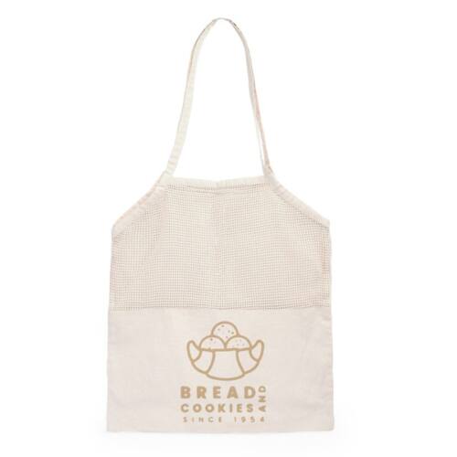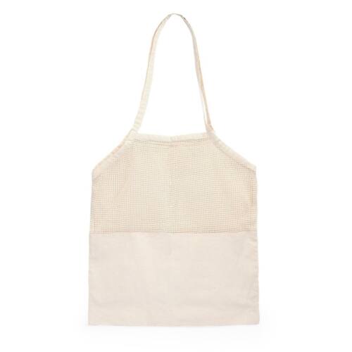 Bolsa para fruta de 100% algodón en color natural de 180g/m². Es ideal para transportar la fruta y la verdura de la compra. Es cómoda de llevar gracias a sus asas largas, tiene forma ergonómica para mejor transporte de productos. Tiene un diseño que combina en mitad de la bolsa material suave y mitad en rejilla. Cuenta con dos asas extensibles de 30 cm de longitud.