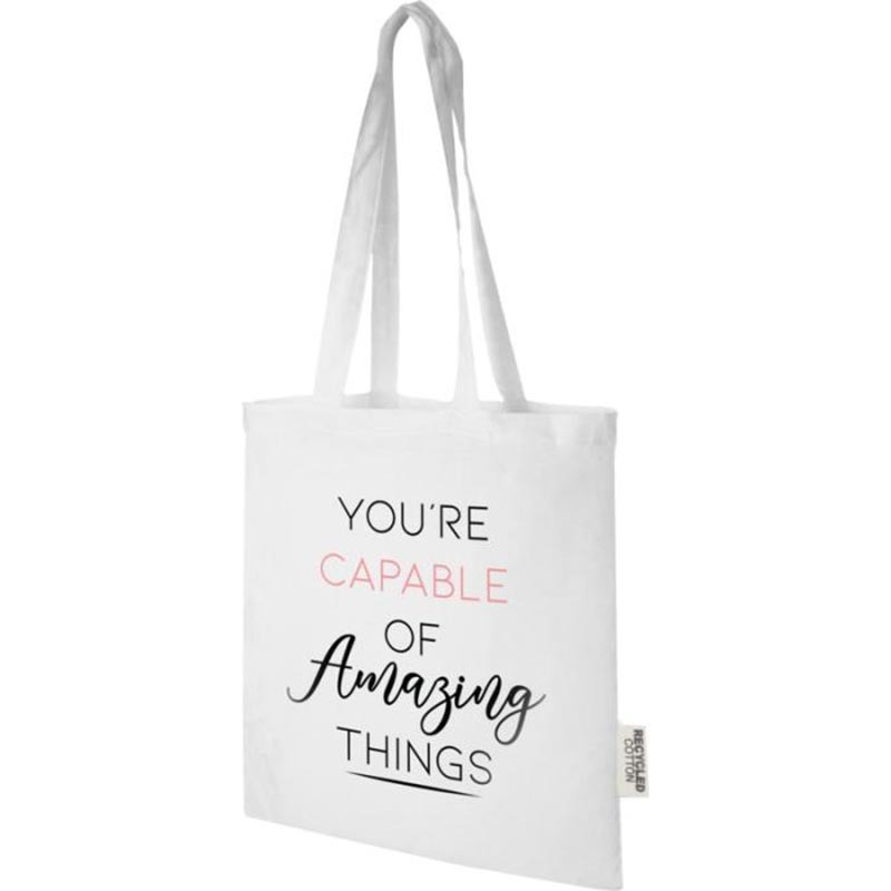 La bolsa tote Madras, fabricada en algodón 100% reciclado con certificado GRS, es la bolsa perfecta para regalar durante cualquier evento, conferencia o para usarla como bolsa de la compra. La densidad del algodón de 140 g/m² hace que la bolsa sea muy resistente, duradera y permita llevar objetos pesados en el compartimento principal. Gracias a sus asas de 30 cm de longitud, esta bolsa es fácil de llevar. Los métodos de impresión disponibles para esta bolsa también cuentan con la certificación GRS, que garantiza la transparencia y la certificación de toda la cadena de suministro. Fabricado en la India. Resiste hasta 5 kg de peso.
