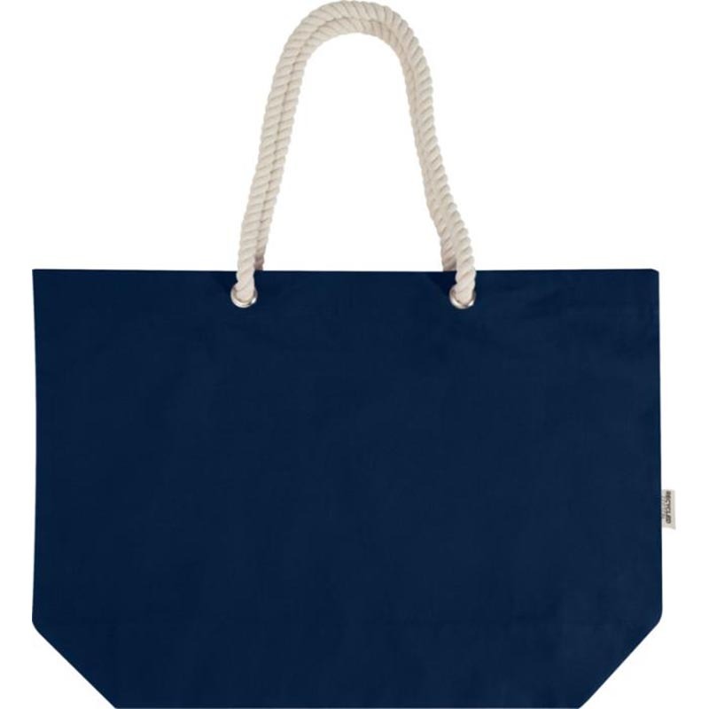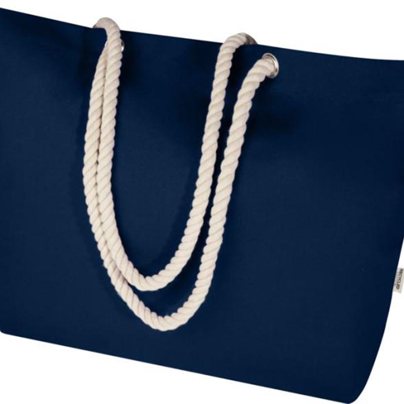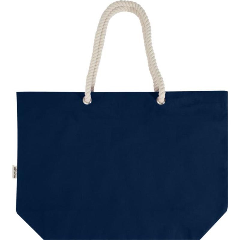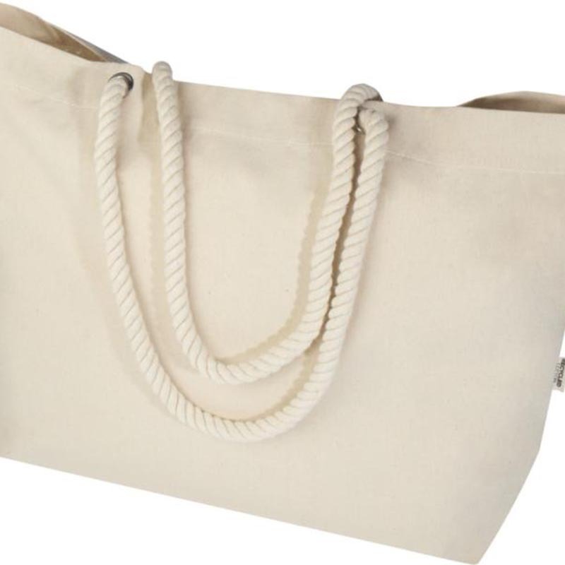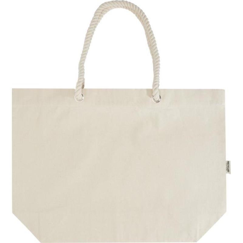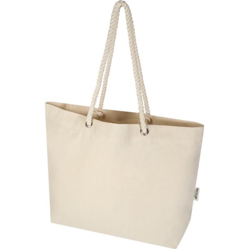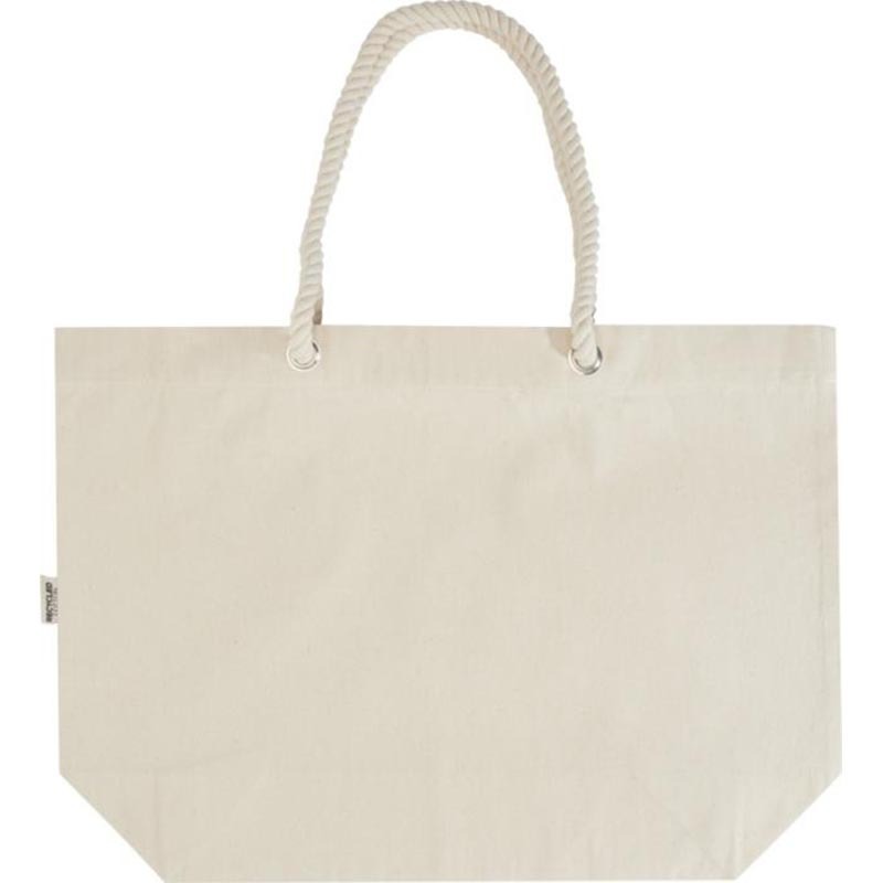 Bolsa Tote de playa de algodón reciclado 100% GRS de 270 g/m². Asas de cuerda de 45 cm de longitud. Capacidad de 18 litros. Resistencia para hasta 10 kg de peso.