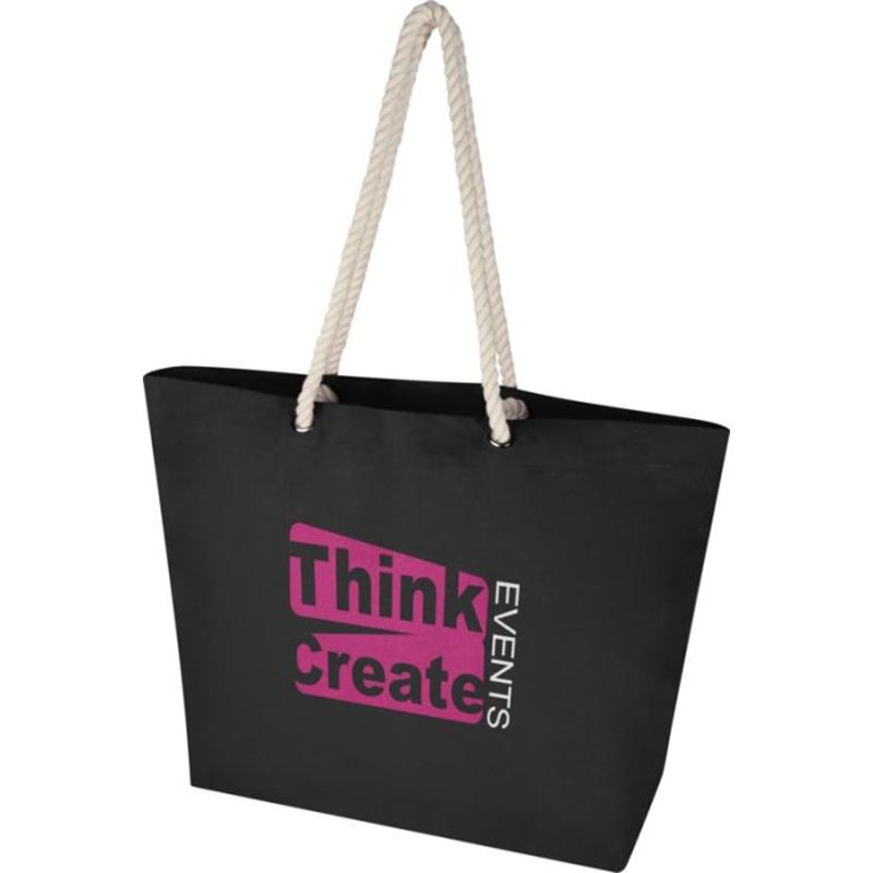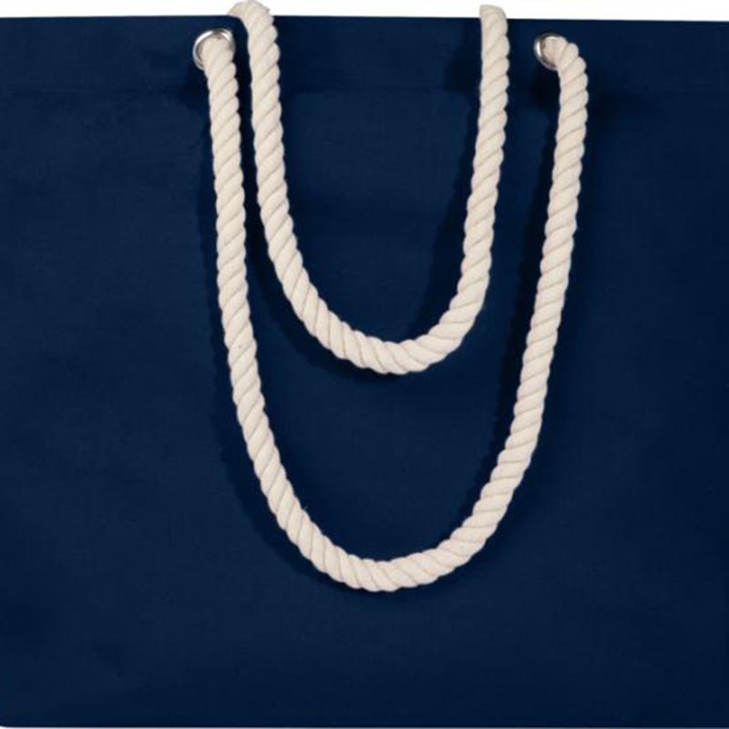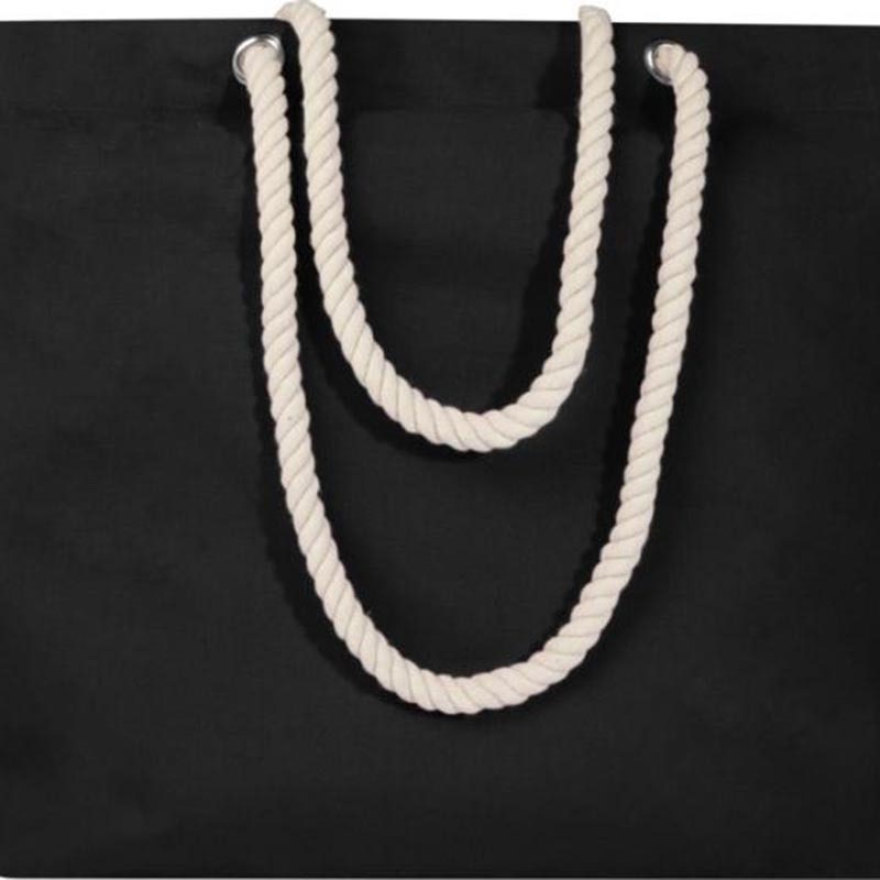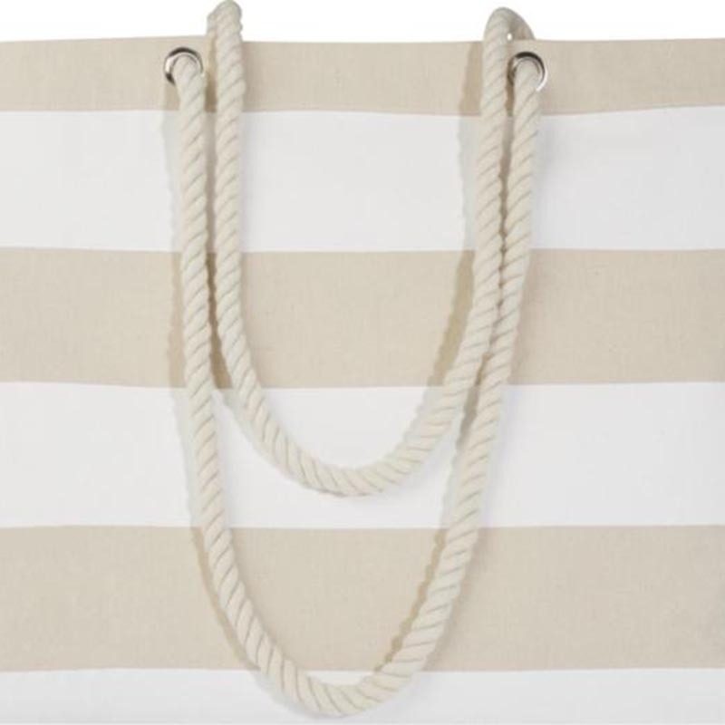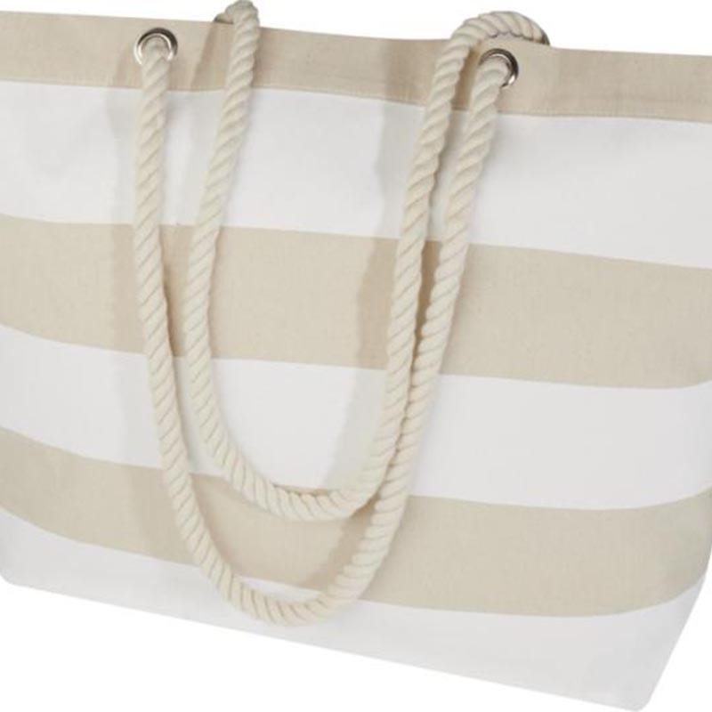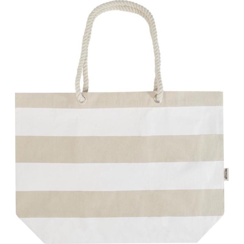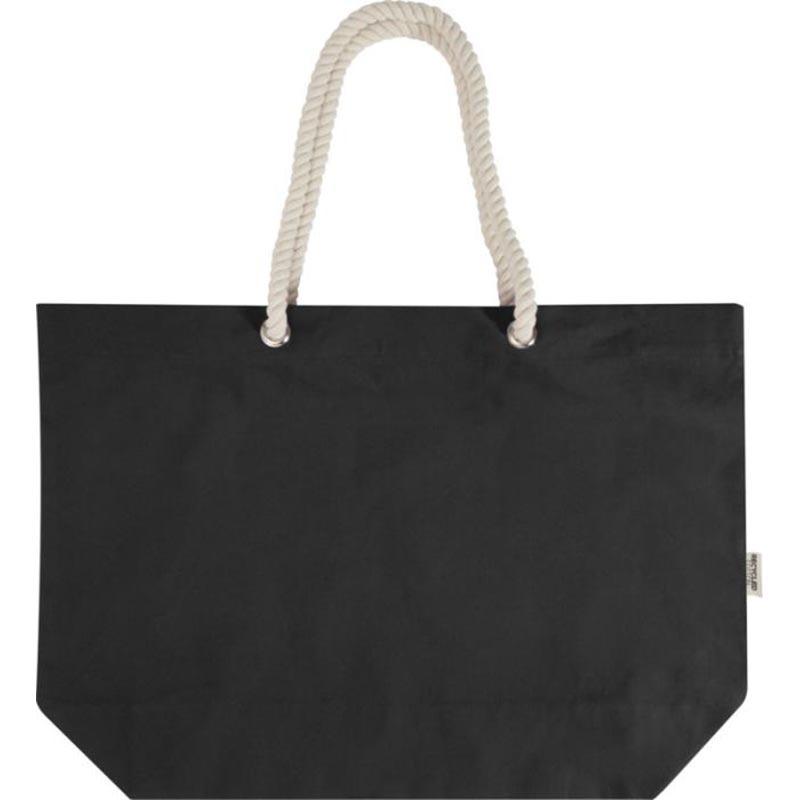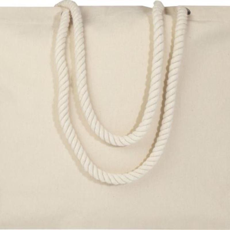 Bolsa Tote de playa de algodón reciclado 100% GRS de 270 g/m². Asas de cuerda de 45 cm de longitud. Capacidad de 18 litros. Resistencia para hasta 10 kg de peso.