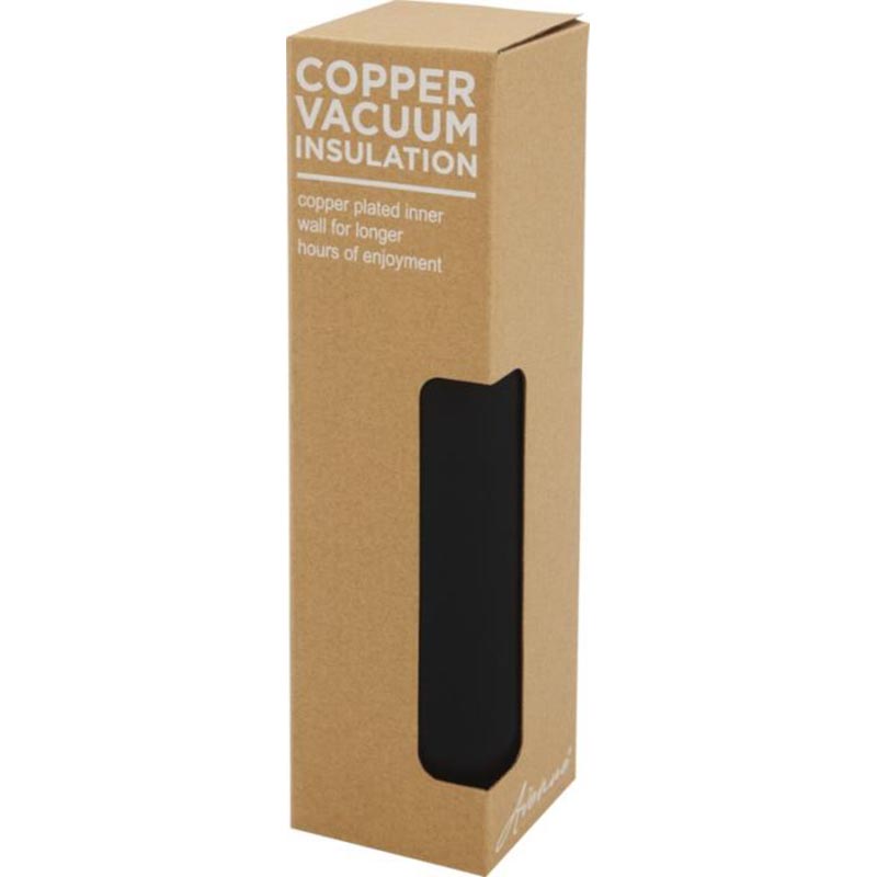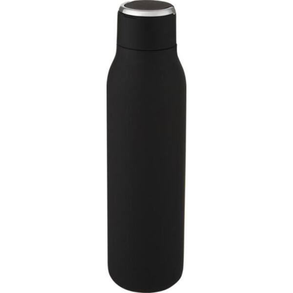 La botella «Marka» cuenta con una construcción de vacío de acero inoxidable con aislamiento de cobre que mantiene las bebidas calientes o frías durante varias horas. La construcción con aislamiento de acero inoxidable 18/8 previene la condensación en el exterior de la botella, y el acabado pulverizado a la moda la hace más duradera. También cuenta con una tapa de rosca a prueba de derrames y un asa de mano duradera de aleación de zinc. No contiene BPA y se ha probado y homologado según la legislación alemana sobre seguridad alimentaria (LFGB). Contenido de ftalatos probado y homologado según la normativa REACH. Se adapta a la mayoría de los portavasos de coche. Capacidad de 600 ml. Se recomienda lavarla a mano. Se presenta en una caja de regalo de cartón reciclado.