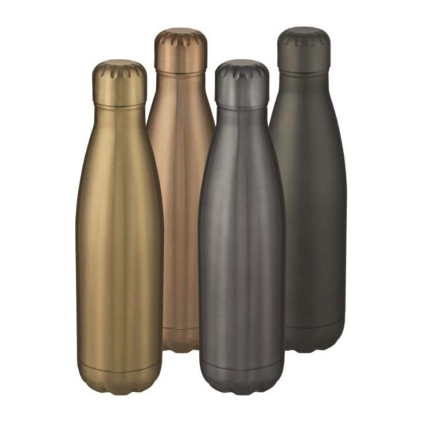 Botella de acero inoxidable con aislamiento al vacío y un diseño icónico. El acero inoxidable 18/8 con aislamiento mantiene las bebidas calientes o frías durante varias horas. Probado y homologado conforme a la legislación alemana sobre seguridad alimentaria (LFGB), y comprobado el contenido de ftalatos según la normativa REACH. Con una base que se adapta a la mayoría de los portavasos, esta elegante botella de agua es un artículo promocional perfecto. Capacidad de 500 ml. Se presenta en una caja de regalo de cartón reciclado. Acero inoxidable. Embalaje: FSC 100% P5.