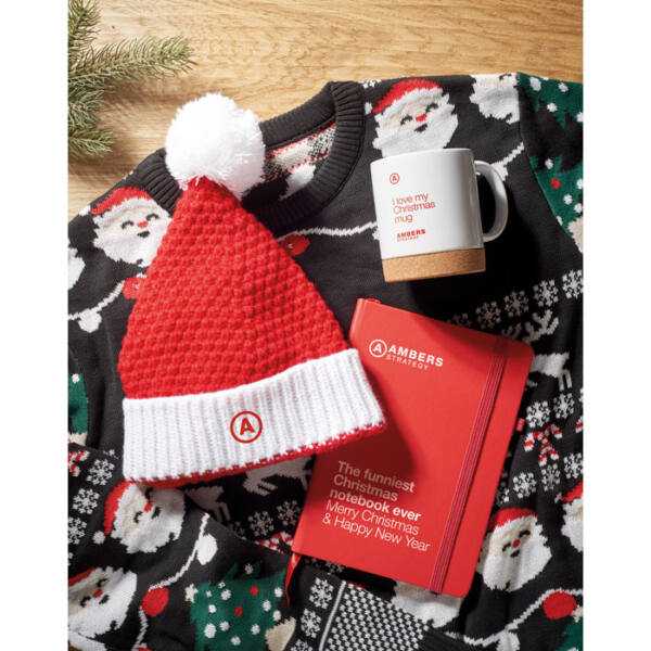 Este gorro de punto navideño con puño y borla está elaborado en suave acrílico elástico. Es un objeto perfecto para vestir acorde con las fiestas de Navidad.