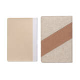 Esta libreta A5 con cargador inalámbrico integrado de 15 W está elaborada con detalles de algodón y corcho en la tapa. Tiene 128 páginas de papel reciclado rayado, es decir, 64 hojas con marcapáginas.