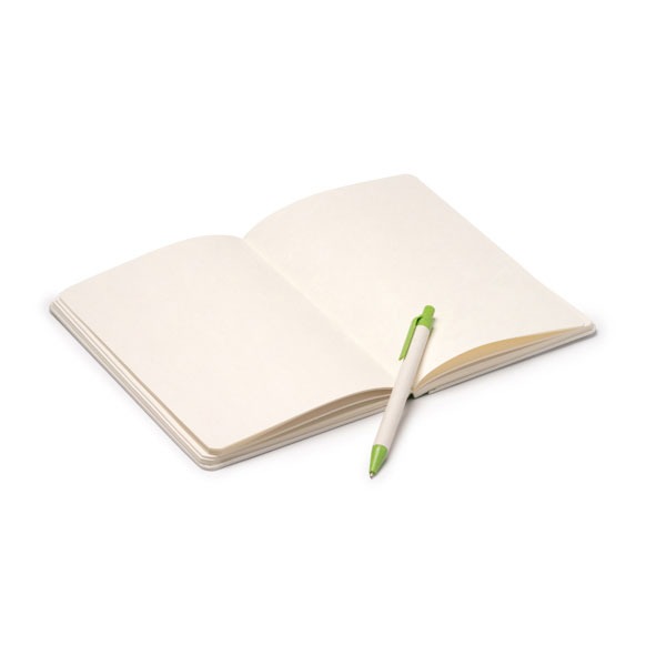 Libreta A5 es de cartón reciclado. Con bolígrafo pulsador de tinta azul.