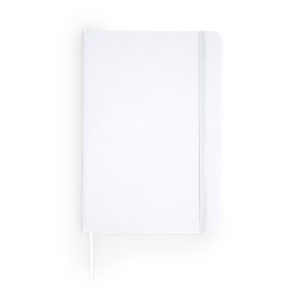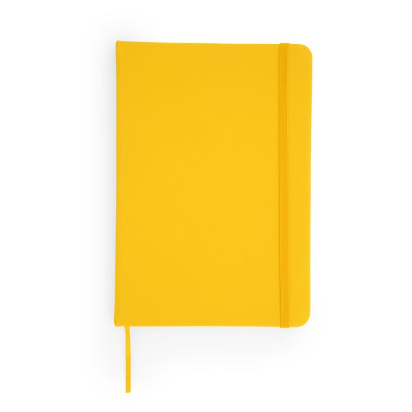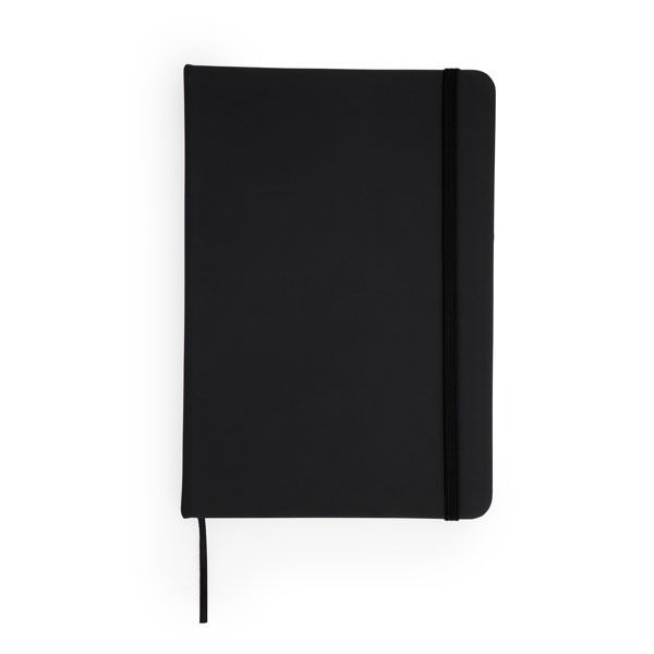 Esta libreta de tamaño A5 con tapa rígida está elaborada en polipiel. Incluye un marcapáginas y una banda elástica de cierre. Tiene un aspecto formal y práctico. Cuenta con 100 hojas lisas. Se presenta en nueve colores con el marcapáginas y la banda elástica a juego. Además, tiene una apertura por el lateral.