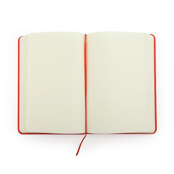 Libreta A5 con tapa rígida de polipiel. Cuenta con 100 hojas lisas.
