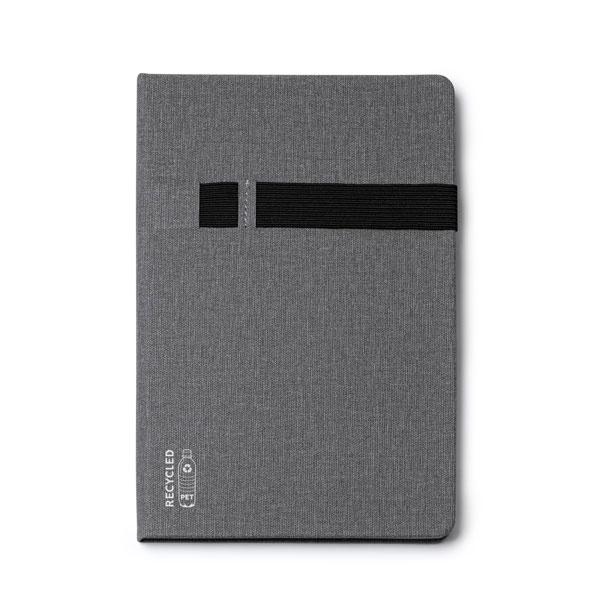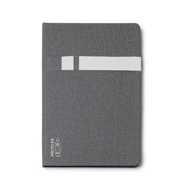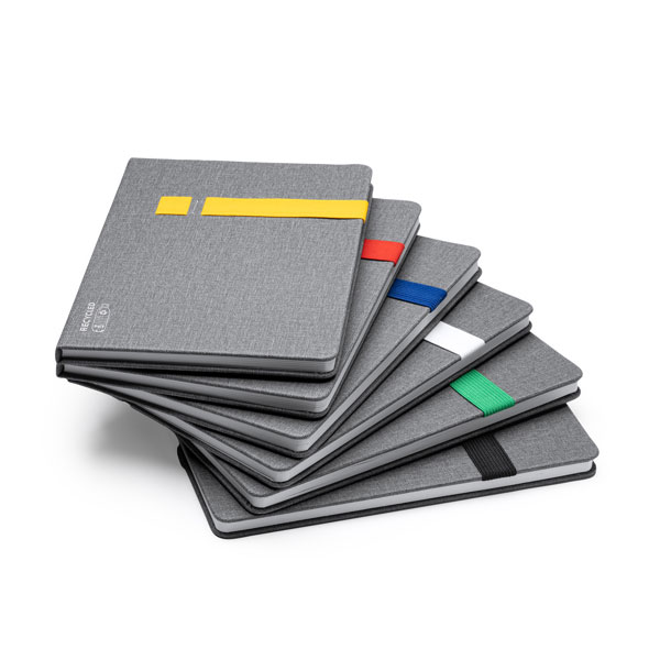 Esta libreta tiene tamaño A5 con tapa rígida y es de RPET. Incluye un soporte para bolígrafo y móvil. Cuenta con 80 hojas lisas. Se presenta con tapas en color gris con detalle en seis colores diferentes. Además, tiene una apertura por el lateral.