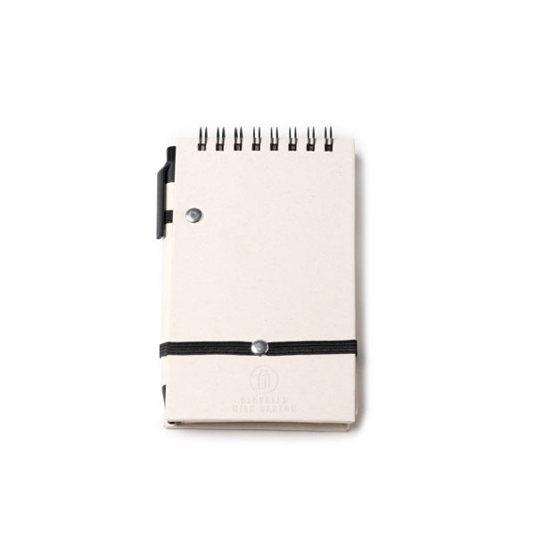 Esta libreta de tamaño A6 fabricada con tapas es de cartón reciclado de briks de leche. Incluye una banda elástica negra para mantenerla cerrada y bolígrafo bicolor de tinta azul. Tiene una espiral en la parte superior y en su interior 80 hojas a rayas. Solo se presenta en color blanco.
