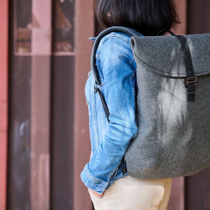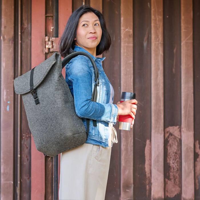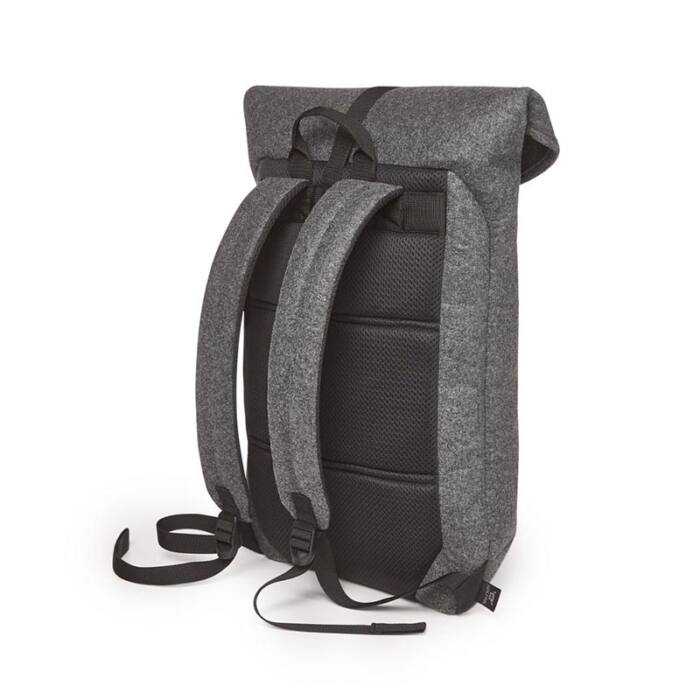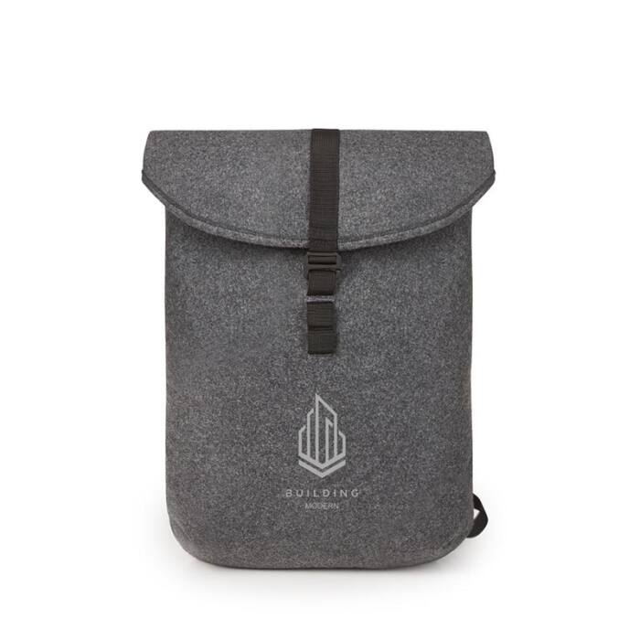 Mochila de fieltro fino con material exterior reciclado con cierre ajustable con correa de lazo.