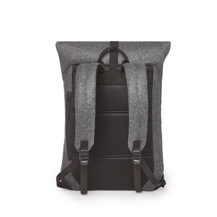 Esta mochila esta fabricada en fieltro fino con material exterior reciclado. Tiene un cierre ajustable con correa de lazo y hebillas metálicas. También, tiene un compartimento acolchado para el portátil y un bolsillo oculto con cremallera en la espalda. Sus asas son acolchadas y ajustables para los hombros.