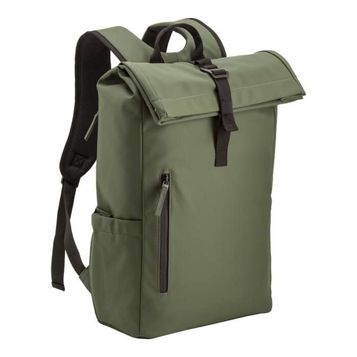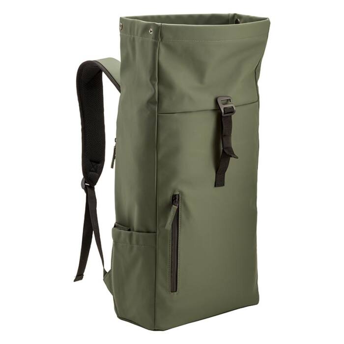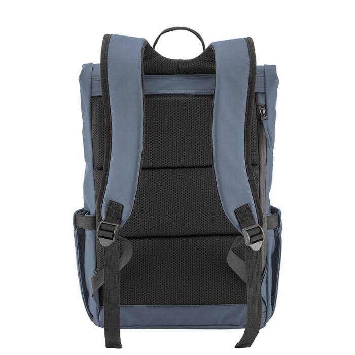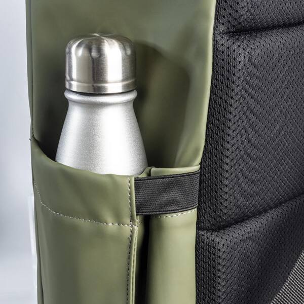 Esta mochila para portátil esta fabricada con PU blando resistente al agua. Tiene un bolsillo trasero acolchado para proteger el portátil y uno frontal con cremallera. Además, tiene dos bolsillos laterales para transportar botellas. La espalda y hombreras estan acolchadas con material transpirable para mayor comodidad.