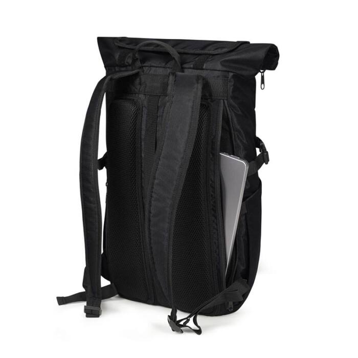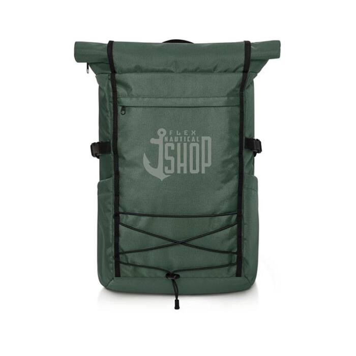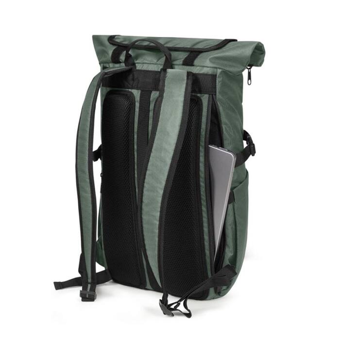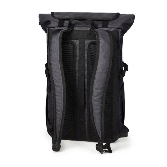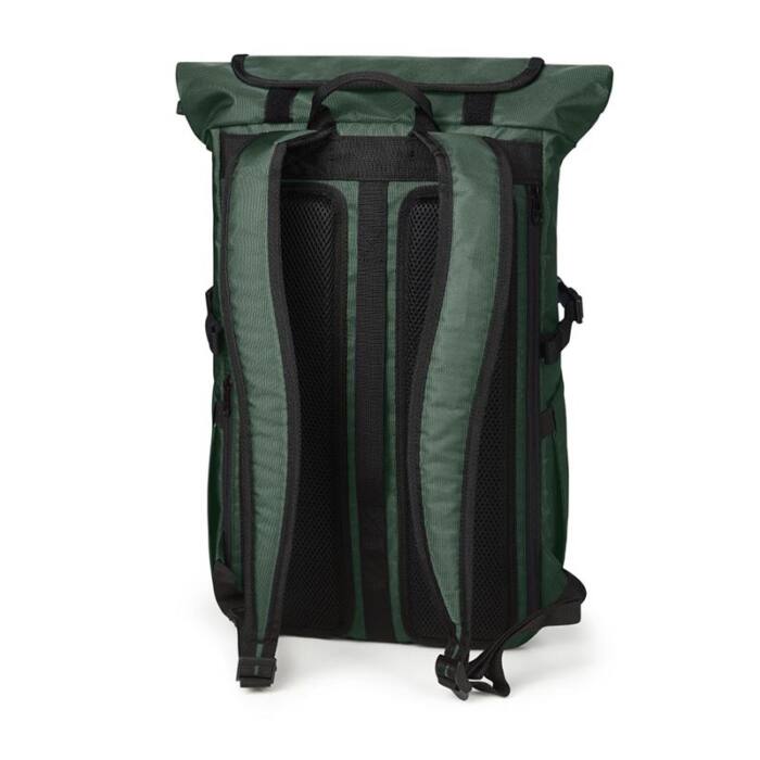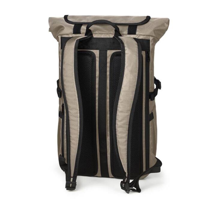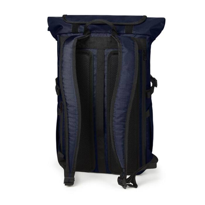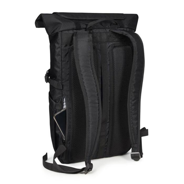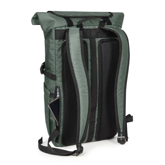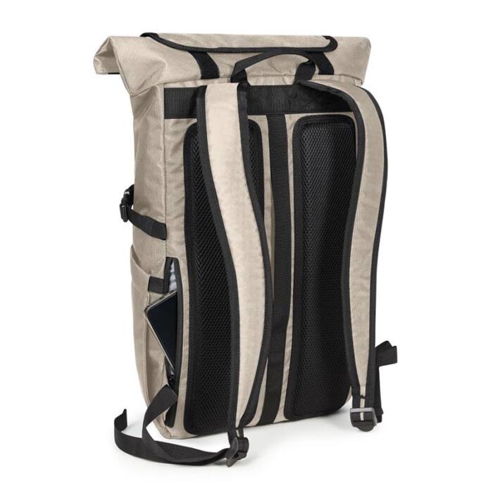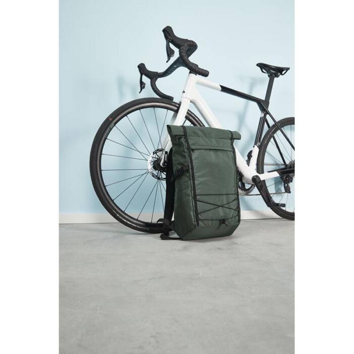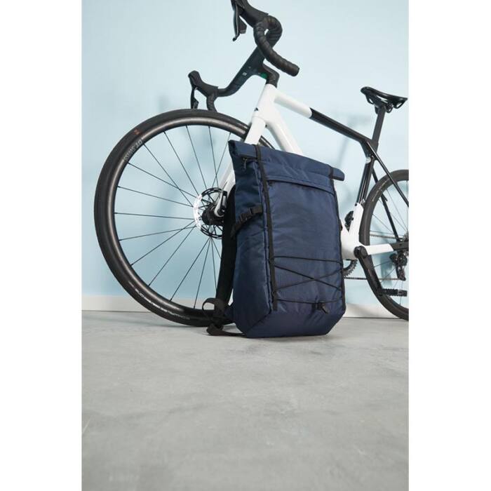 Esta mochila versátil con ampliación de volumen está fabricada en material RPET. Tiene un compartimento principal con cremallera, otro acolchado accesible por separada con forro de terciopelo en la parte posterior para el portátil, un bolsillo plano en el interior, otro frontal con cremallera, dos laterales para botellas y uno oculto con cremallera en la parte posterior. Sus asas en la parte superior tiene la función de lazo de sujeción para barras de trolley y además, una correa funcional de lazo con cordón elástico.
