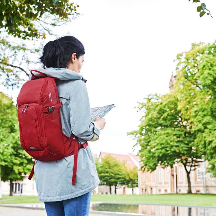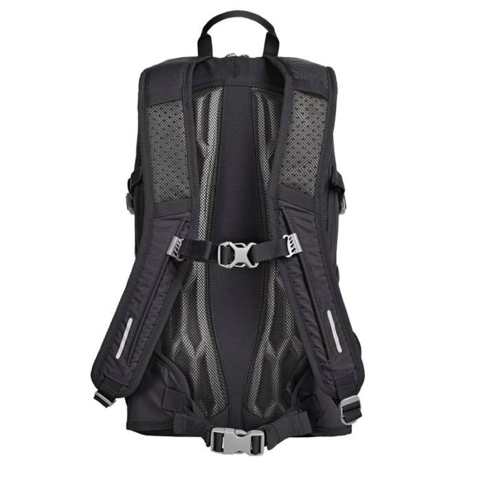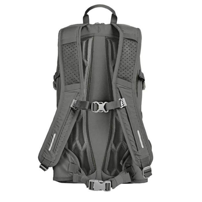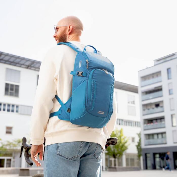 Esta mochila para el día a día esta fabricada con PET reciclado (RPET). Es muy práctica para ir en bicicleta gracias a su sistema de espalda en forma de panal para más ventilación y un cómodo acolchado. Para una buena sujeción, tiene una correa pectoral ajustable para el pecho y una correa pélvica acolchada en el lateral. Tiene un compartimento principal con cremallera de dos vías y un bolsillo plano deslizante en el interior. Además, tiene un puerto trasero adecuado para los auriculares o para un tubo de sistema de hidratación con correa autoadherente para fijar el tubo.
