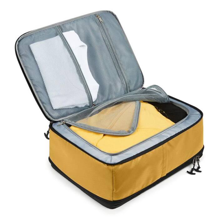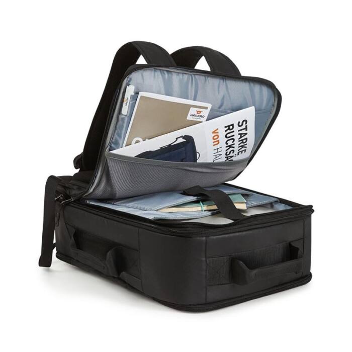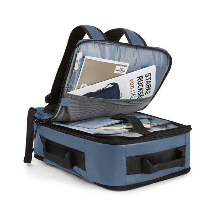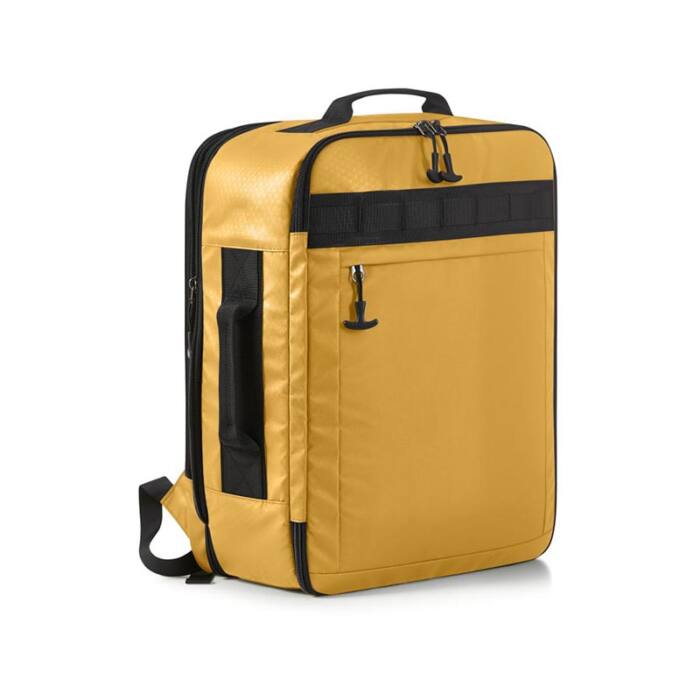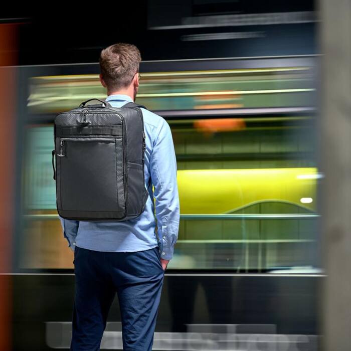 Esta mochila de viaje con ampliación de volumen esta fabricada con PET reciclado (RPET). Tiene un bolsillo frontal con cremallera y correa de lazo, otro lateral para las botellas, dos de malla con cremallera en la tapa del compartimento y otro deslizable para documentos A4. Es muy amplia y tiene un compartimento acolchado con tapa de malla con cremallera de dos vías accesible por separado. Además, tiene un compartimento para portátil con forro de terciopelo y cierre elástico. Su sistema de transporte en la espalda está bien acolchado con una correa ajustable para el pecho y bucle de fijación para la barra de trolley en la espalda.