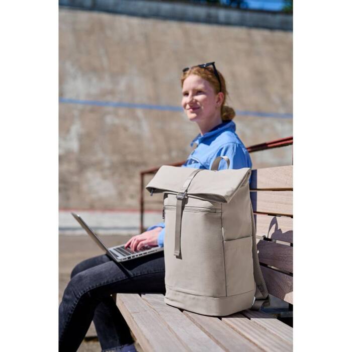 Esta mochila enrollable para portátil esta fabricada de poliéster. Tiene un compartimento principal con cremallera y sistema de cierre ajustable. También, tiene una correa de lazo en la tapa y accessorios metálicos de alta calidad. Tiene un bolsillo frontal con cremallera, dos laterales y un lazo de cierre en la espalda para la asa del trolley.