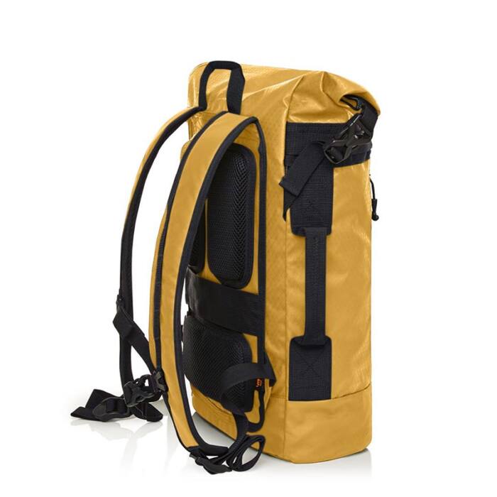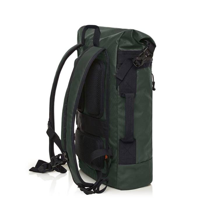 Esta mochila enrollable esta fabricada con PET reciclado (RPET). Tiene un compartimento principal con cremallera y hebillas laterales, otro oculto con cremallera, un bolsillo frontal con cremallera, otro interior acolchado y una cinta funcional en la parte delantera. Su sistema de transporte acolchado con correa de pecho ajustable en altura, asas en ambos lados y en la parte trasera; y una asa de sujeción para el trolley en la parte trasera.