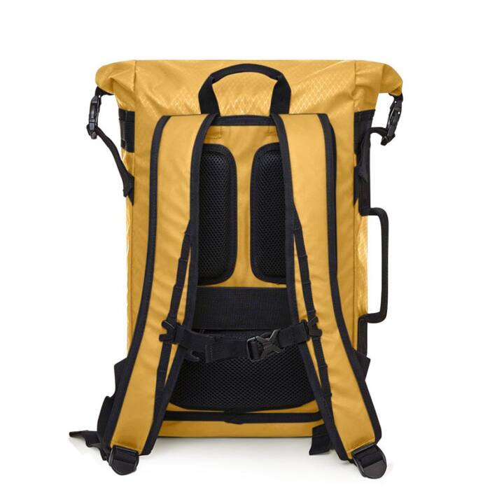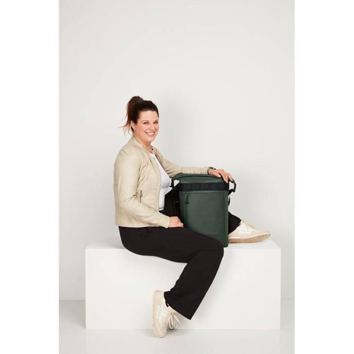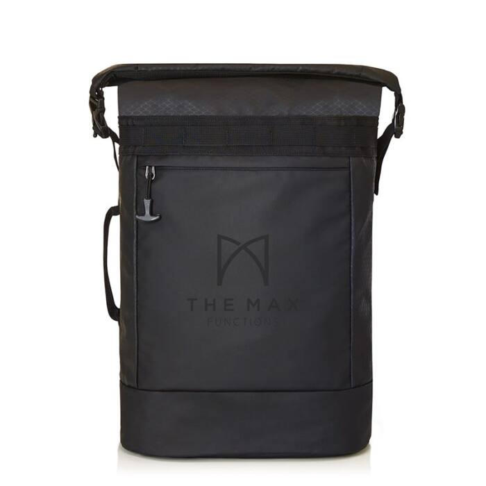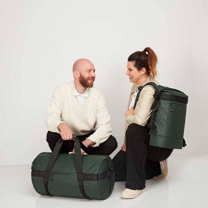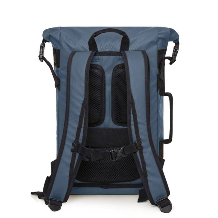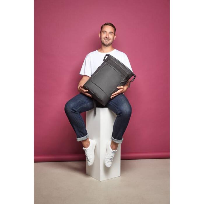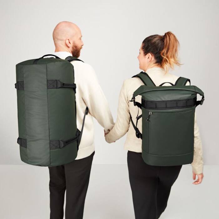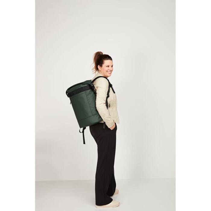 Mochila enrollable de RPET con una cinta funcional en la parte delantera y asa de sujeción para el trolley.