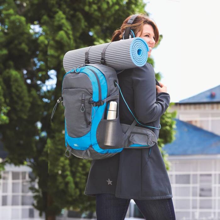 Esta mochila ligera de espalda acolchada esta fabricada con poliéster. Tiene un compartimento principal grande con bolsillo insertable y salida para auriculares. También, tiene dos bolsillos laterales exteriores y una fijación para los bastones de trekking con correas laterales. Además, tiene un compartimento dónde se guarda una funda para la lluvia. Tiene unos tirantes acolchados con ajuste de longitud superior y inferior y una correa ventral acolchada con bolsillos con cremallera.