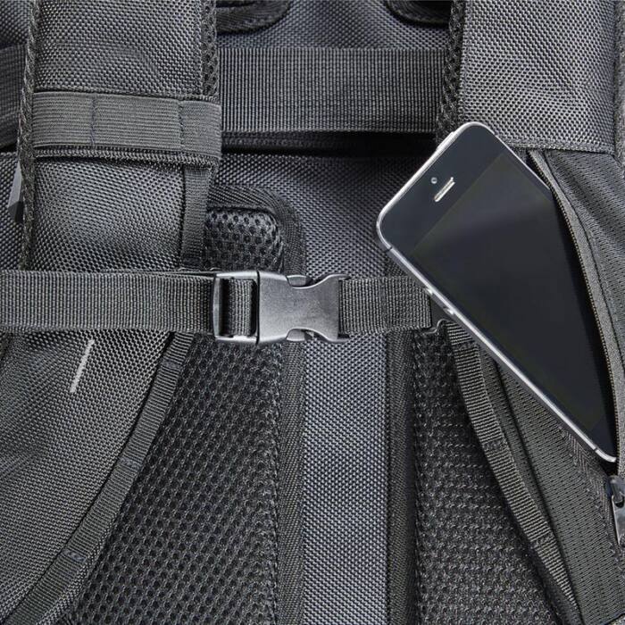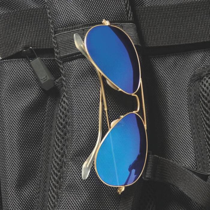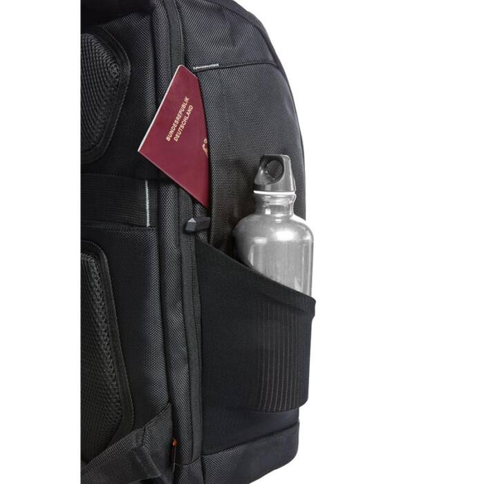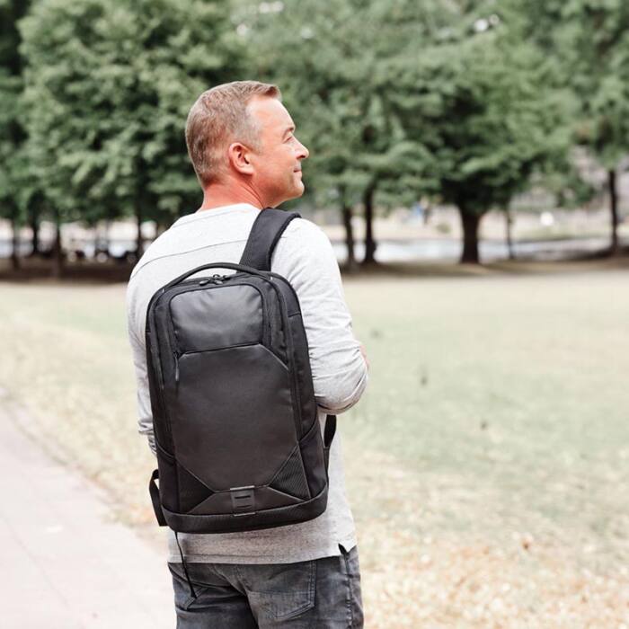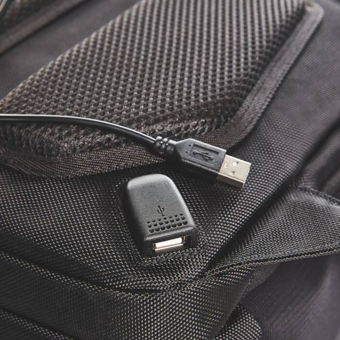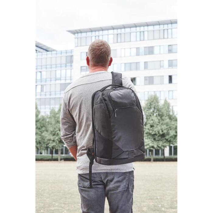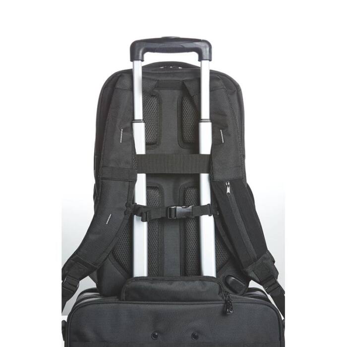 Esta mochila de negocios de color negro está fabricada en poliéster. Tiene un ribete reflectante con opción de fijación de luz LED para la bicicleta y un puerto USB con cable de conexión integrado. Tiene varios compartimentos: uno principal con cremallera de dos vías con forro de terciopelo apto para portátil de 17», un bolsillo delantero con cremallera, dos laterales de malla elástica para botellas y dos ocultos con cremallera. Su sistema de transporte acolchado con correa pectoral elástica, extraíble y ajustable en longitud más un bucle de fijación para los bastones de trolley.
