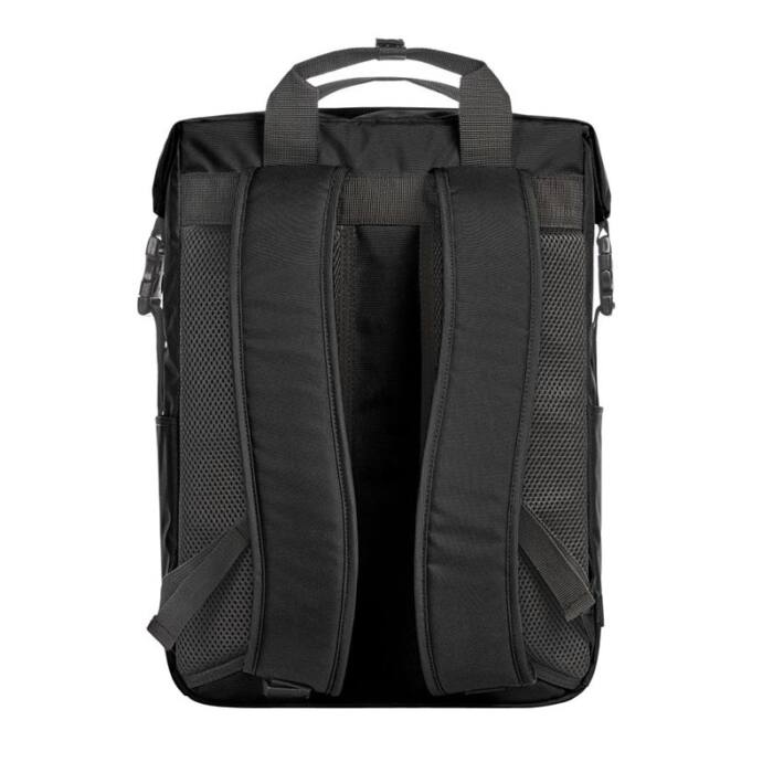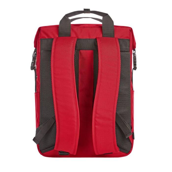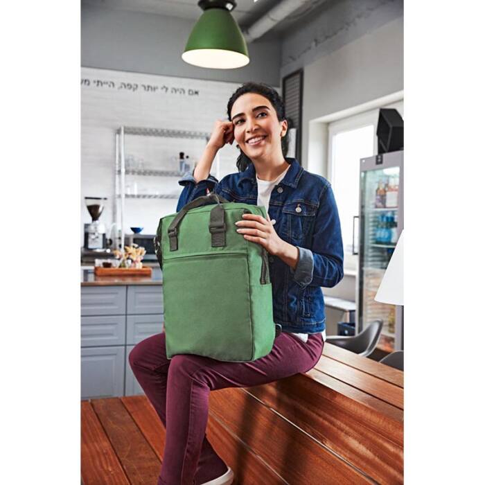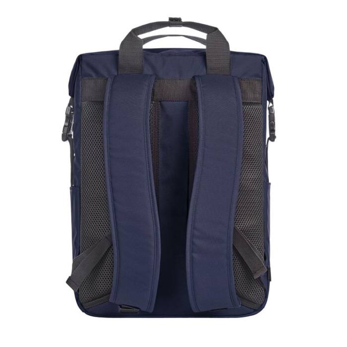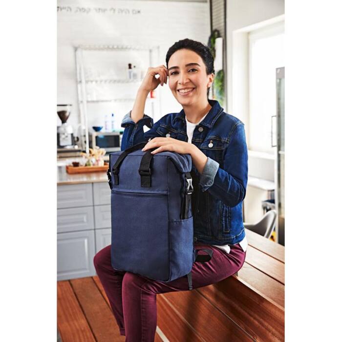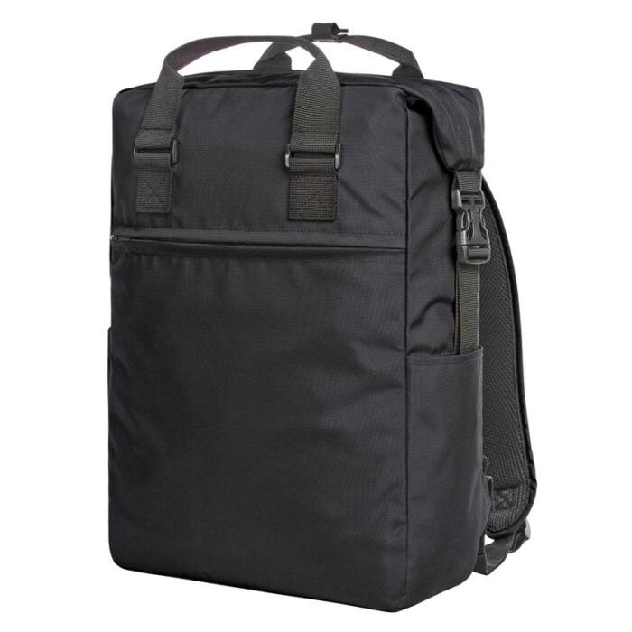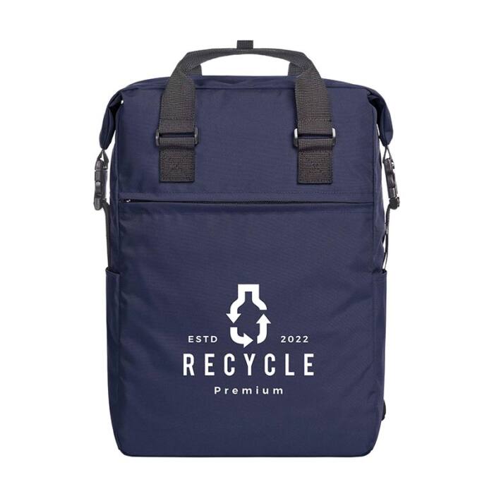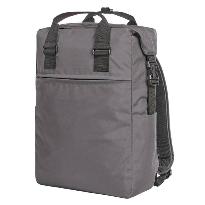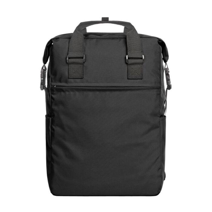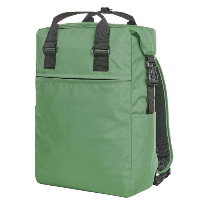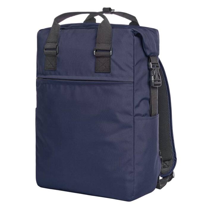 Esta mochila de forma rectangular para portátil esta fabricada con PET reciclado (RPET). Tiene un compartimento acolchado para proteger el portátil, uno plano deslizante en el interior y hebillas laterales a presión para una apertura cómoda. También, tiene un bolsillo frontal con cremallera, dos laterales para botellas de agua y unas asas con puño de botón a presión.