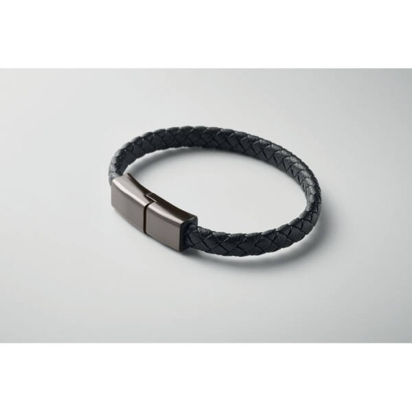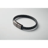 Esta pulsera con cable de carga y transferencia de datos de 60 W de tipo C a tipo C está elaborada en PU. Además, tiene un detalle trenzado de aleación de zinc. Su diámetro es de aproximadamente 21 cm.