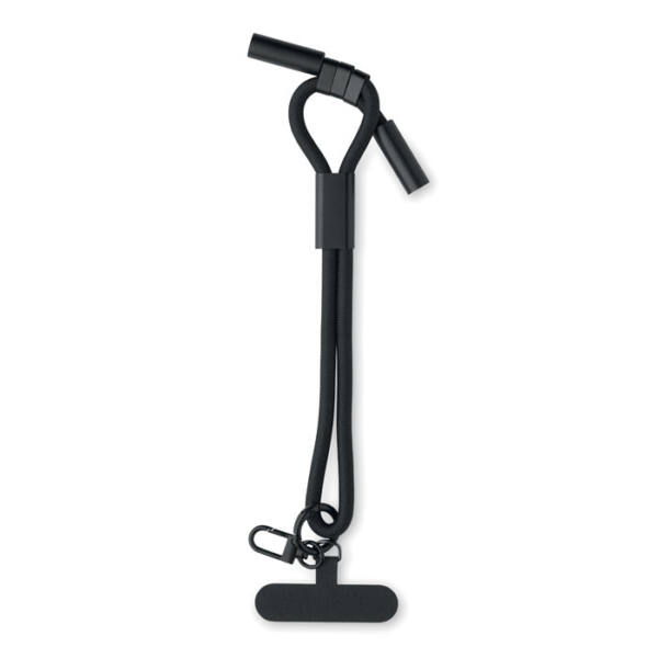Esta pulsera de cable de carga y datos de 60 W de tipo C a tipo C está elaborada en RPET. Además, tiene un soporte para cable de teléfono y un clip para llaves.
