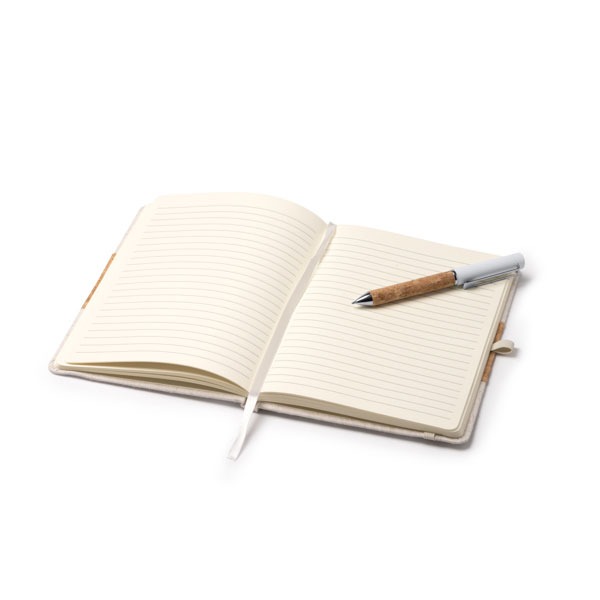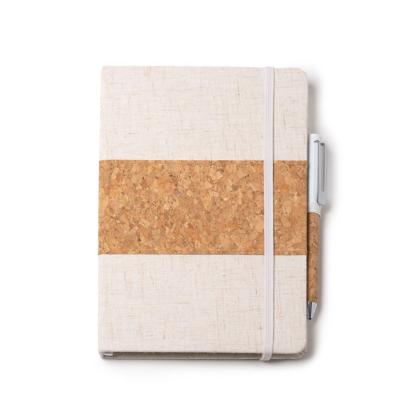Este set de bolígrafo y libreta de tamaño A5 con tapa rígida de algodón y corcho. Incluye una banda elástica de cierre, un soporte para bolígrafo, un marcapáginas y un bolígrafo en estuche de cartón kraft.. Cuenta con 80 hojas rayadas. Bolígrafo metálico con empuñadura de corcho y tinta azul. Se presenta en color crudo. Además, tiene una apertura por el lateral.