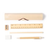 Este set de escritura está elaborado en madera natural. Viene presentado en estuche de madera. Incluye los 5 productos fundamentales como regla, lápiz, bolígrafo de cartón reciclado con pulsador, una goma de borrar y un sacapuntas.