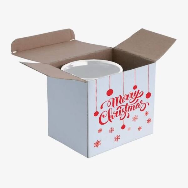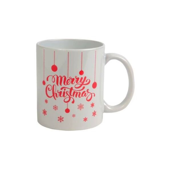 Esta taza está elaborado en cerámica. Tiene una estampación en color rojo con diseño de navidad. Además, es perfecta para marcaje de sublimación. Se presenta en una caja blanca estampada con el mismo diseño que la taza. Es un artículo sostenible y reutilizable perfecto para ir acorde con el medio ambiente.